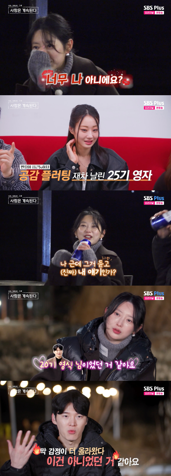 26일 오후 방송된 ENA, SBS플러스 연애 예능 '나는 솔로, 그 후 사랑은 계속된다'에서는 25기 영자가 자신의 1순위 20기 영식에게 플러팅을 이어갔다.