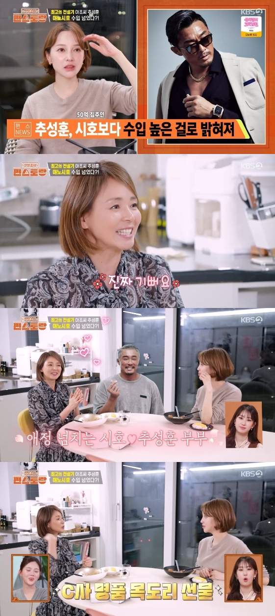 그런가 하면 야노 시호는 "추성훈이 내 수입을 넘었을 거다"라고 말해 모두를 놀라게 했다. 그는 "다행이다. 추상이 기쁠 거라고 생각하니까 진짜 기쁘다"라고 미소 지었다.