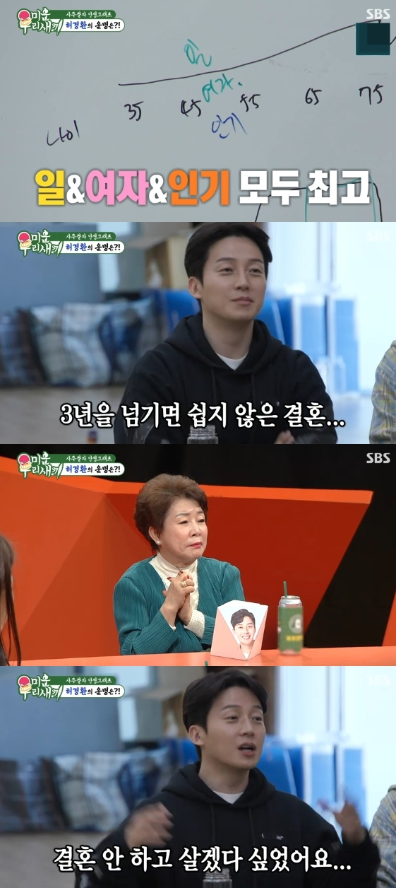 이에 허경환은 "저도 개인적으로 무조건 3년 안에 안 하면 그냥 결혼 안 하고 살수도 있겠다 싶다"라고 속내를 털어놨다.