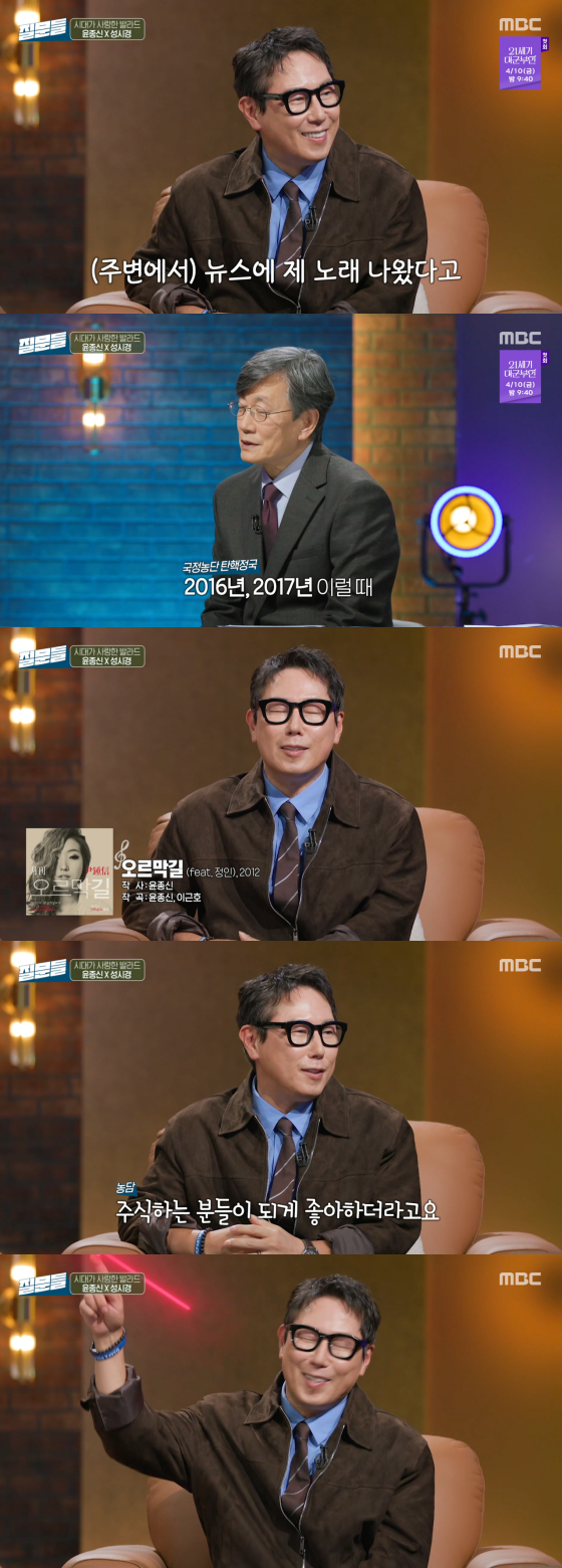 손석희의 말을 들은 윤종신은 "예고 없이, 알려주지 않고 사용하셔서 주변에서 '뉴스에 노래 나왔어'라고 알려줬다. 그때 혼란스러운 시국이지 않았나"라고 떠올렸다.