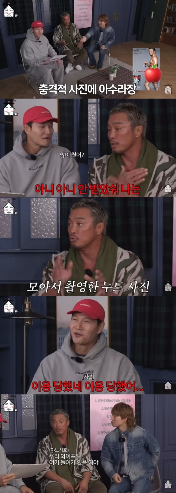 추성훈은 "광고가 아니다. 옛날부터 친하게 지낸 카메라를 하는 친구가 유명 세계에서 100명인가 200명인가 모아서 누드를 찍었는데 그중 한 명이었다"라고 설명했다. 이에 김종국은 "이용당했다. 내가 더 잘 찍을 것 같다"라고 팩폭을 던졌다.