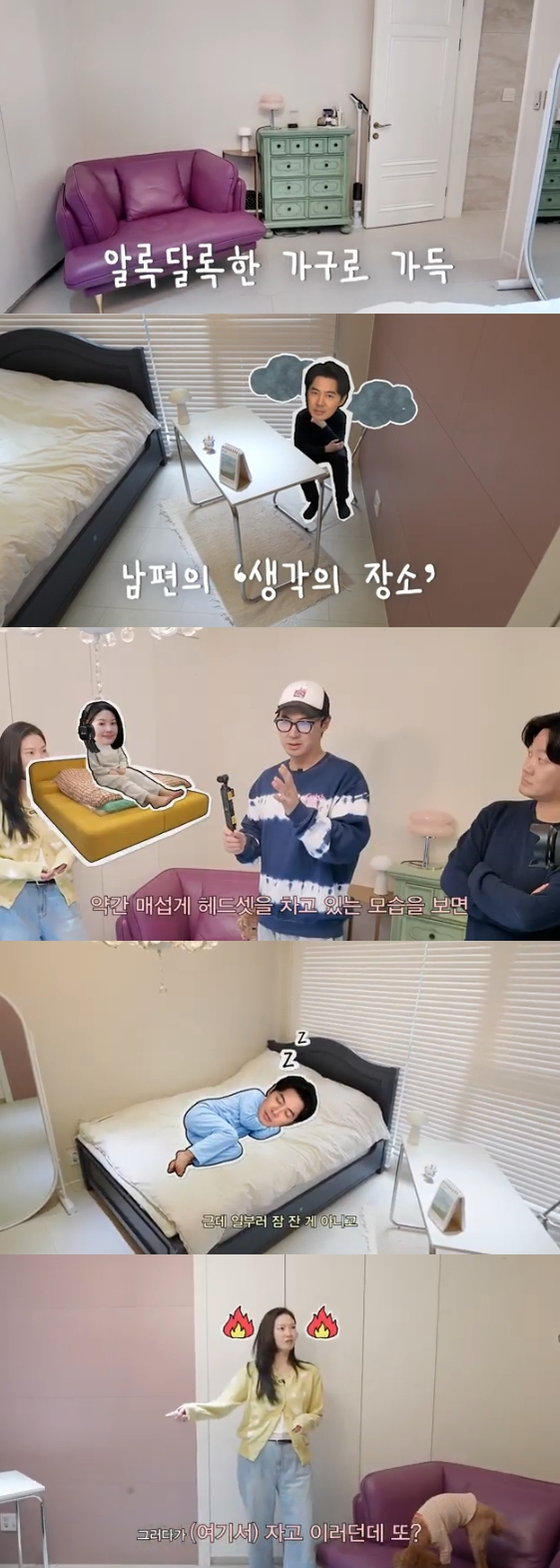 이때 전진은 방 한 쪽에 놓인 테이블을 가리키며 "여기는 1년에 한 두 번 다퉜을 때 제가 생각하는 장소다"라고 밝혀 시선을 모았다. 그는 "싸우고 여기서 고뇌하다가 안방에 갔는데 침대에서 아내가 매섭게 헤드셋을 차고 있는 모습을 보면 다시 뒷걸음질 쳐서 이 방으로 온다. 한숨을 쉬면서 '언제 가야 하지?'라고 생각한다"라고 털어놔 웃음을 안겼다.