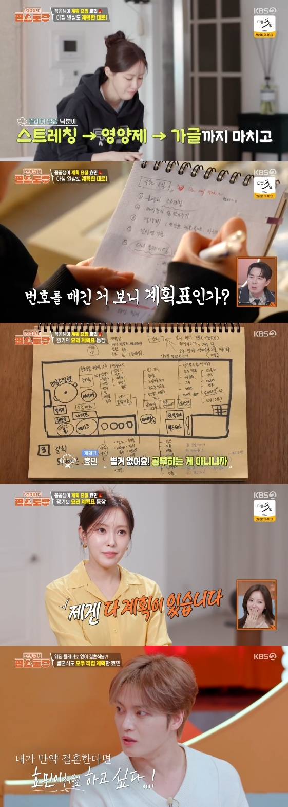 그런가 하면 효민은 결혼 1주년 파티 계획이 담긴 노트 3권을 공개해 시선을 모았다. 그 안에는 디테일이 돋보이는 조리대 계획표는 물론, 각종 재료부터 그릇까지 섬세하기 그려진 요리들이 담겨있었다.