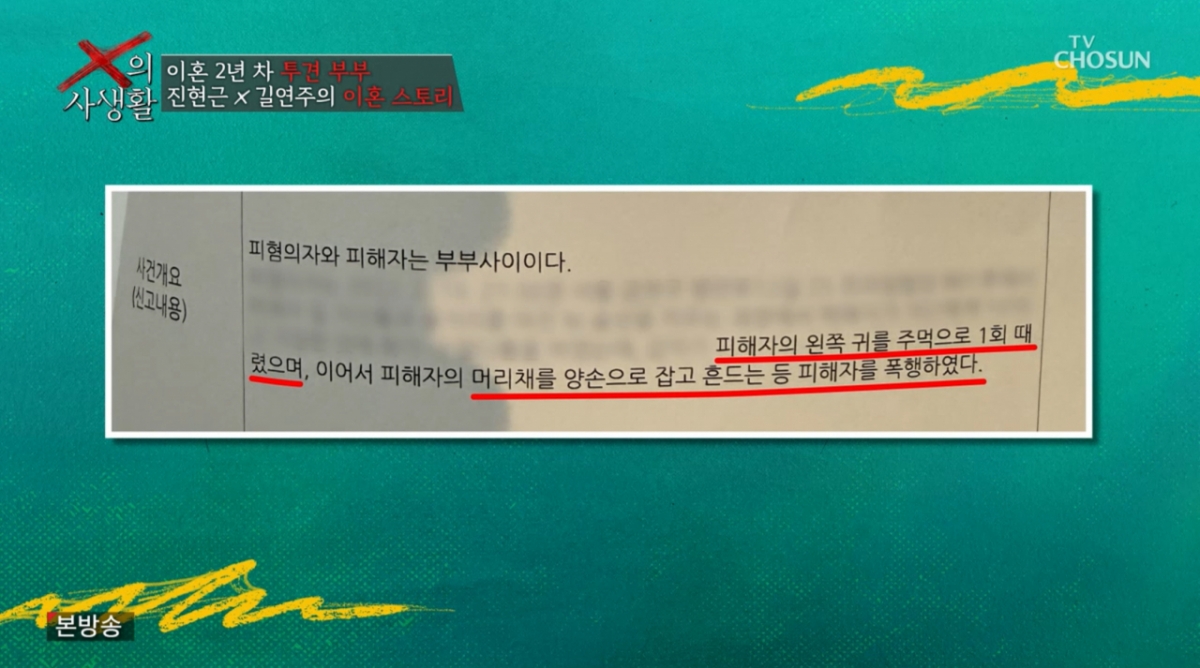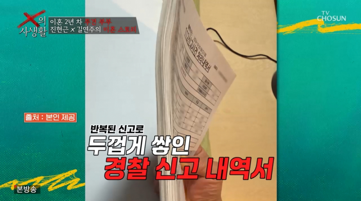 7일 방송된 TV조선 예능 프로그램 'X의 사생활'에서는 지난 회차 아내 길연주의 인터뷰에 이어, 남편 진현근의 가감 없는 심경 고백이 이어졌다. 스튜디오의 김구라, 장윤정, 정경미, 천록담은 남편이 털어놓은 믿기 힘든 결혼 생활의 실체에 경악을 금치 못했다.