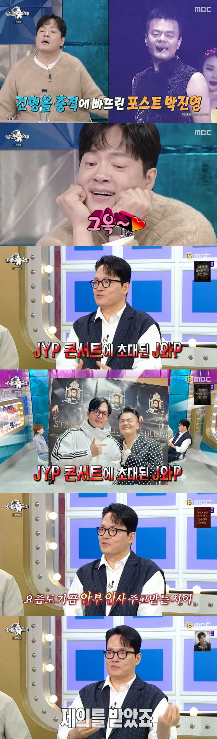 김형묵은 "'라디오스타'에서 제가 박진영 선배님 성대모사한 걸 보고 선배님이 콘서트에 초대해 주셔서 연락처를 주고 받았고 가끔 안부 인사를 주고 받고 있다"라고 했다.