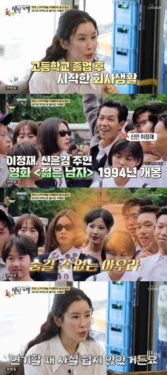 이태란은 "고등학교 졸업 후에 3년간 회사에 다녔다. 그때 아르바이트로 단역을 했다"라고 과거를 떠올렸다. 이어진 자료화면에는 1994년 개봉한 이정재, 신은경 주연의 영화 '젊은 남자'에 단역으로 출연한 이태란의 모습이 공개됐다.