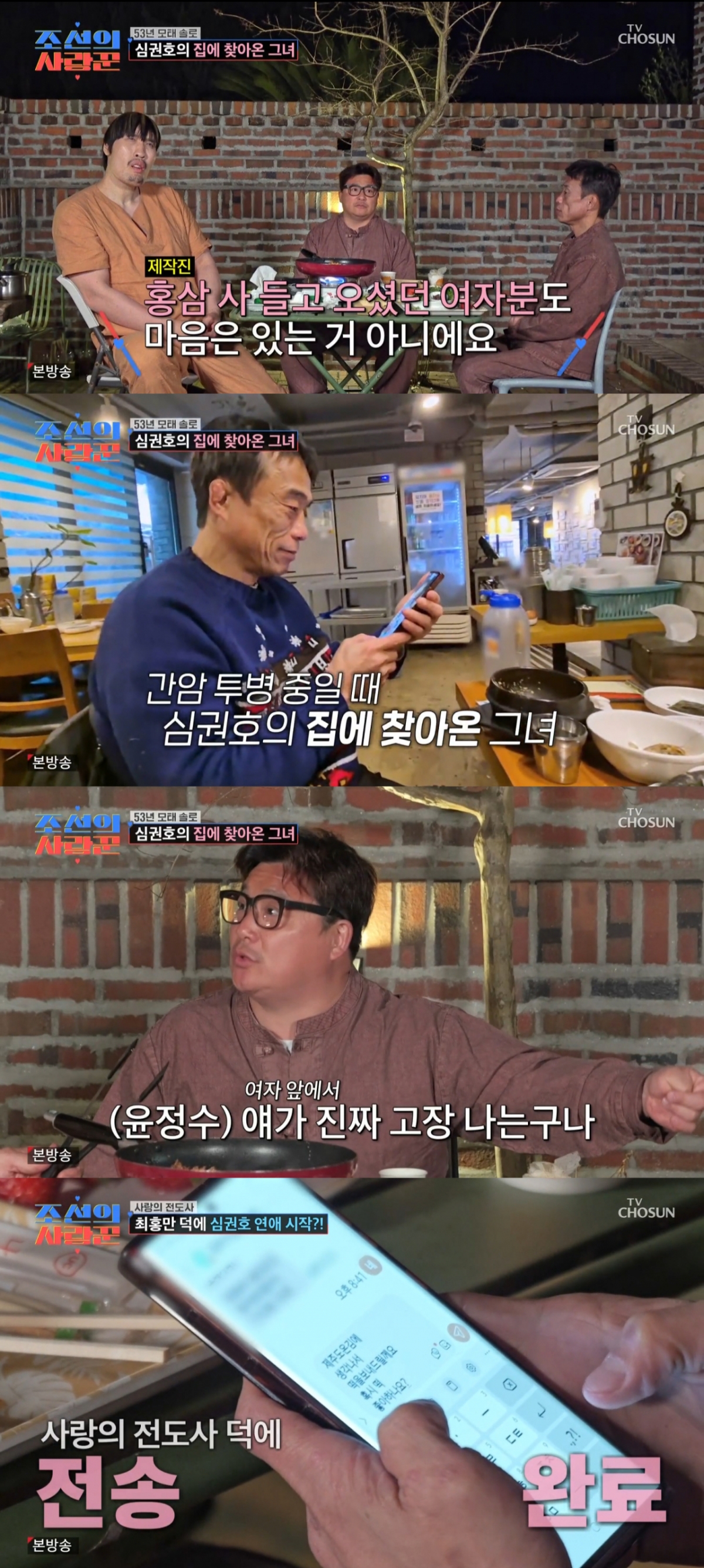 13일 방송된 TV조선 예능프로그램 '조선의 사랑꾼'에서는 제주도 여행 중 식사하며 결혼에 대한 진솔한 대화를 나누는 윤정수, 최홍만, 심권호의 모습이 그려졌다.