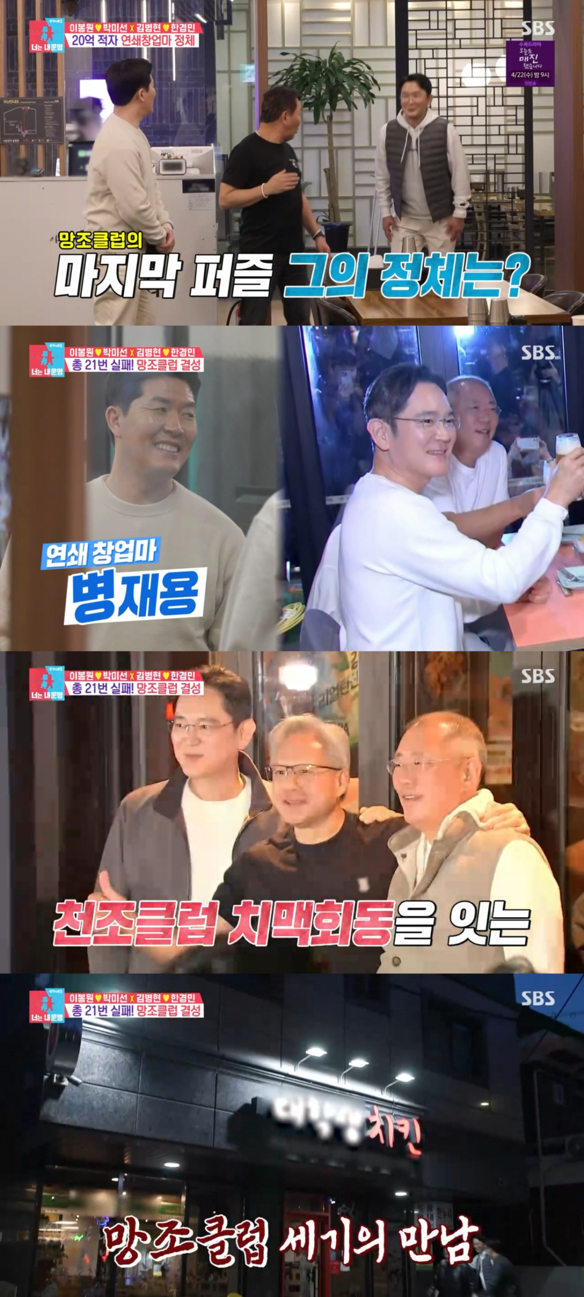 이날 세 사람은 과거 삼성전자 이재용 회장과 엔비디아 젠슨 황 CEO 등이 모여 화제가 됐던 '천조 클럽'의 치맥 회동을 언급하며 전열을 가다듬었다. 이들은 "우리도 그들처럼 세계적인 비즈니스 네트워크를 만들자"며 호기롭게 건배를 제안했으나, 실상은 사업으로만 20억을 날린 윤형빈을 포함해 '망조'의 기운이 가득한 실패 연대기였다.