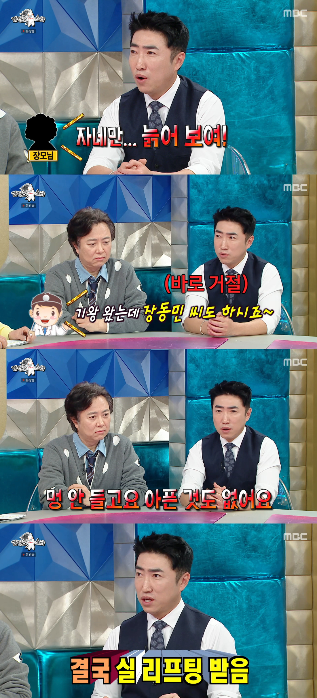 이날 장동민은 "장모님께서 TV만 보시면 '자네만 늙어 보여'라 하시며 우울해하셨다"며 "속상해하셔서 아내와 함께 성형외과에 갔다"고 말했다.