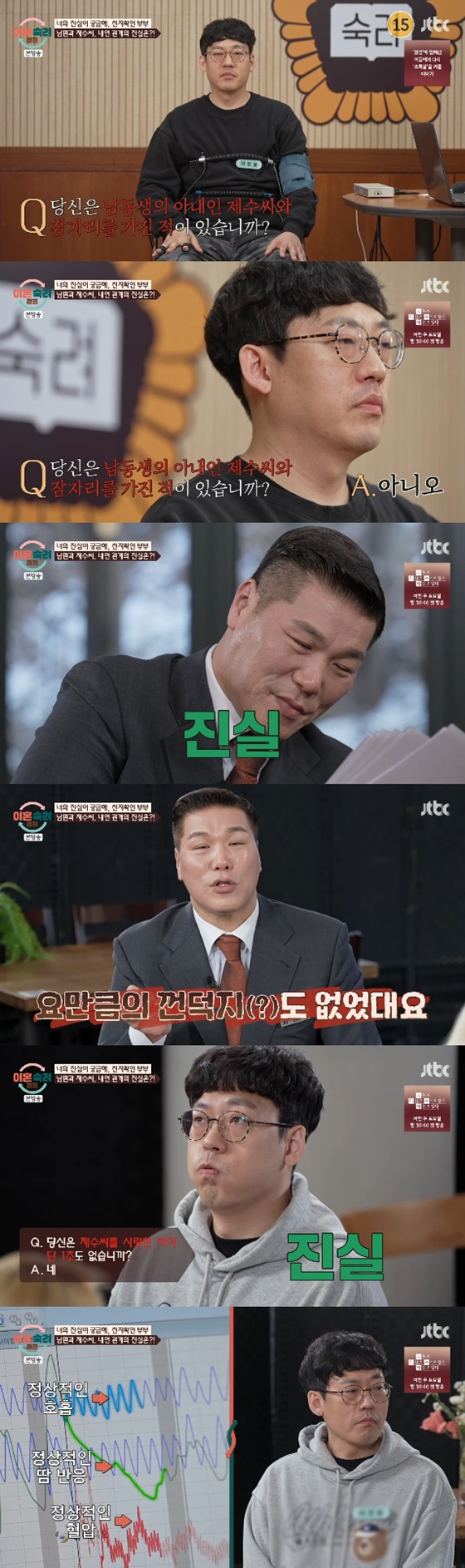 16일 방송된 JTBC 예능 프로그램 '이혼숙려캠프'에서는 최종 조정에 앞서 배우자의 속마음을 확인할 수 있는 심리생리검사 결과가 공개됐다.