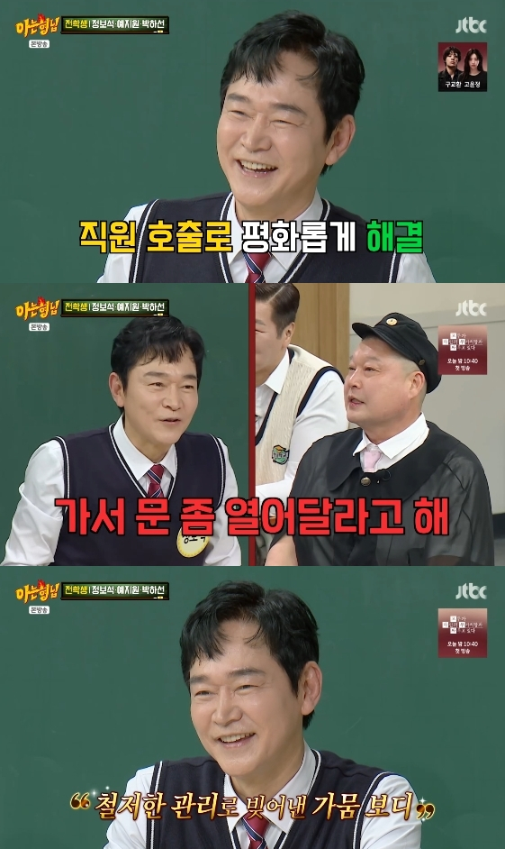 그는 "옷 홀랑 벗고 부탁했다. 사우나에서 만나 라커를 잠갔는데 키를 잊어버려서 문 좀 따달라고 했다"라고 설명해 폭소를 유발했다.