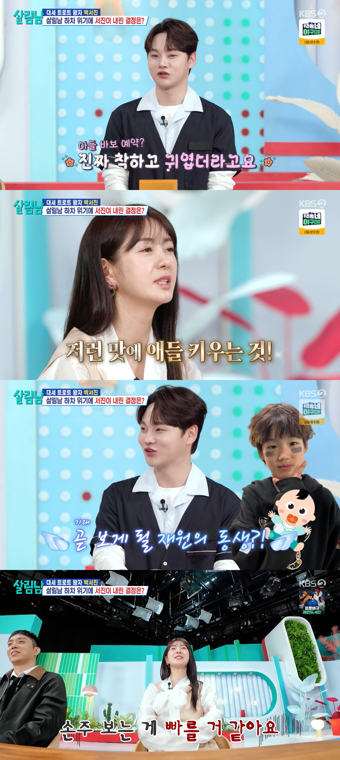 이요원은 "아기가 있으면 분위기가 달라진다"며 "저런 맛에 애들 키우는 것"이라고 했고, 박서진은 "아기가 그렇게 좋으면 재원(셋째 아들)이 동생이 곧 생기는 것이냐"고 미소를 지으며 말했다.