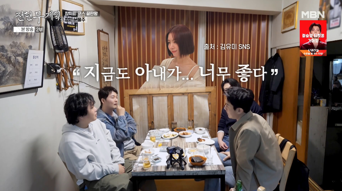 전현무는 참치를 먹다가 정우에게 "난 결혼을 아직 안 해봤잖냐. 지금도 아내가 좋냐"고 조심스럽게 질문했고, 정우는 망설임 없이 "너무 좋다"고 말했다.