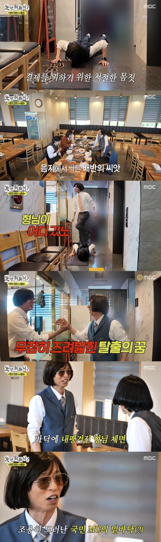 태연하게 화장실로 향하던 유재석은 갑자기 낮은 포복 자세로 출구를 향해 숨죽여 전진했다. 결제를 피하기 위해 바닥을 기던 유재석을 본 주우재는 "형님이 어디 갔지?"라며 유재석을 밟고 지나가 웃음을 안겼다.