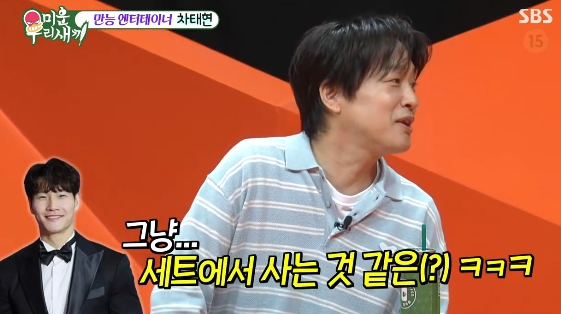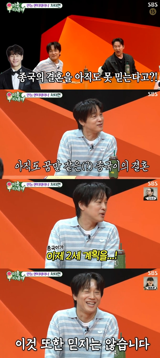 이날 차태현은 얼마 전 결혼한 김종국을 언급하며 "일단 결혼식에서만 봤고 그냥 세트에서 사는 것 같다. 신혼집에 가본 적도 없고, 제가 그 집에 가기 전까지는 믿을 수가 없다. 전 국민이 꿈을 꾼 것 같다"라고 밝혀 웃음을 안겼다.