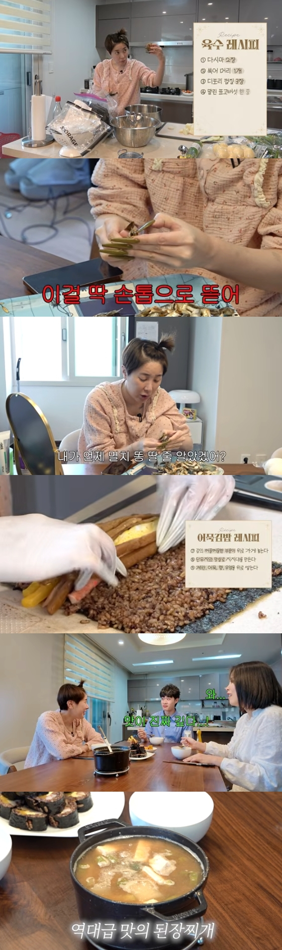 그는 무, 양파, 표고 버섯 등을 넣고 된장찌개 육수를 끓이기 시작했다. 서인영은 "코인은 안 쓴다. 무를 넣으면 시원한 맛이 나고, 양파를 넣으면 단맛이 나고 말린 표고버섯을 넣으면 감칠맛이 난다"라고 비법을 소개했다.