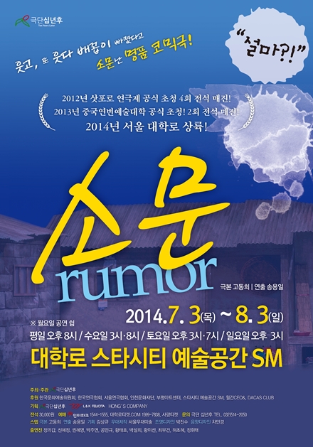 3일부터 공연을 시작하게 된 '소문'은 2009년 원작 '나비, 날아가다'로 인천연극제에 참가하여 최우수작품상, 연출상, 희곡상, 여자 최우수연기상, 남녀 신인 연기자상을 수상했다.