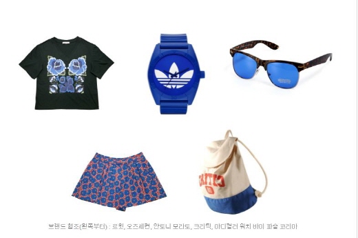 가령 브랜드 안토니 모라토의 선글라스 제품은 렌즈에 직접 블루컬러를 입혀 유니크한 패션 포인트로 제격이다. 다르게는 크롭 팬츠 형태에 상큼 발랄한 보색 대비를 적용한 제품도 여성들에게 많은 인기를 얻고 있는데 이때 아디다스 오리지널 로고가 돋보이는 젤리소재 워치 또는 캔버스 소재 백을 함께 매치하면 캐주얼한 감성을 더할 수 있다. 무엇보다 농도가 다른 파란색으로 그려진 플라워 프린트를 어두운 티셔츠 위에 그려 입체적이고 시원하게 디자인 한 티셔츠는 블루의 장점을 잘 활용한 좋은 예 이다.