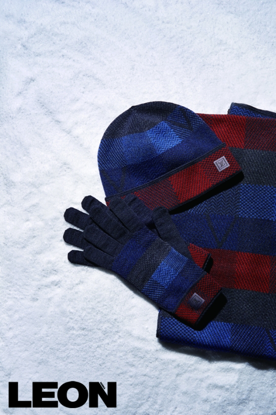 많은 브랜드에서 출시하고 있는 셋업 아이템 중에서 '레옹'이 추천하는 것은 루이 비통의 머플러, 모자, 장갑 3종 세트입니다. 블루와 레드가 섞인 모자이크 컬러에 다미에 패턴과 물결 패턴 등을 믹스해 스포티하면서도 고급스러운 분위기를 연출하죠.