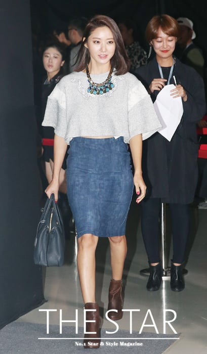 드라마에서 편안하고 친근한 이미지와 자연스러운 연기로 사랑받고 있는 대세 배우 한그루. 캐주얼한 그레이 크롭트 톱에 무릎길이의 데님 스커트를 매치하고 에스닉한 목걸이를 더한 차림은 편안하지만 세련된 느낌이다.