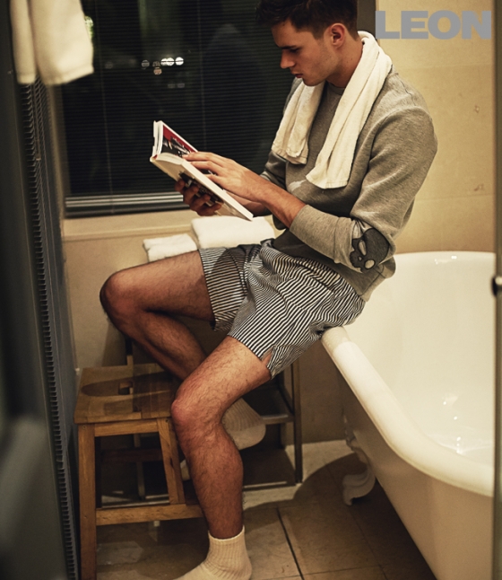 스웨트 셔츠를 트렁크와 함께 매치하면 마치 쇼츠를 입은 듯한 느낌을 줄 수 있다는 사실! 너무 헐렁한 것보다는 어느 정도 몸에 맞는 사이즈의 트렁크로 편안하고 세련된 이지웨어 룩을 연출해보세요. 스컬 디테일 스웨트 셔츠 20만원대, 하이드로겐. 스트라이프 트렁크 2만5000원, 갭. 양말은 에디터 소장품.