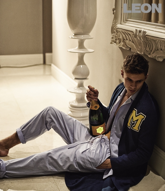 나이트 셔츠를 떠오르게 하는 파자마와 나이트가운을 갖춰 입은 남자는 어딘지 모르게 섹시합니다. 밖에서는 물론 집에서도 적당한 멋을 낼 줄 아는 남자라는 인상을 주죠. 로고 포인트의 나이트가운 21만원, 코튼 파자마 가격 미정, 모두 멜트. 로고에 불이 들어오는 샴페인 가격 미정, 뵈브 클리코.