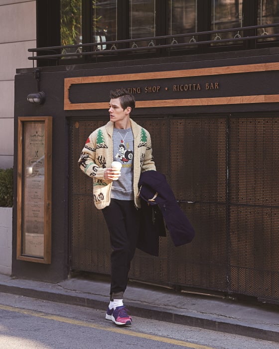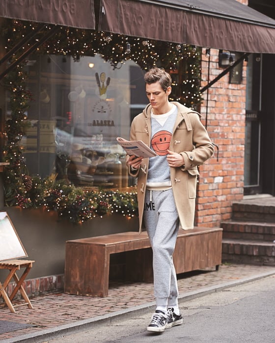 가벼운 색감의 더플코트와 카디건으로 연출한 프레피 룩에 넉넉한 피트의 스웨트 팬츠를 더하자 전에 없던 신선함이 연출됐다. 상의의 컬러와 반대되는 컬러의 팬츠로 무게감을 유지하는 것이 포인트. 그린 더플코트 43만원, 런던 트레디션 by 아이엠샵. 오트밀 숄칼라 재킷 34만5000원, 집시앤선 by 아이엠샵. 그레이 스웨트 셔츠 10만9000원, 체스윅 by 배럴즈. 스웨트 팬츠 19만8000원, 레이닝 챔프 by 플랫폼 플레이스. 화이트 슬립온 4만5000원, 반스.