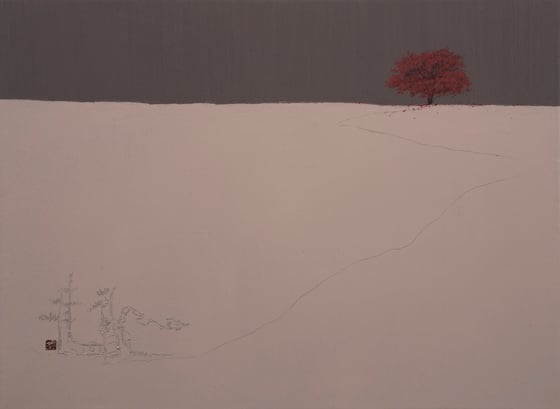 하단부의 흐릿한 세한도와 지평선 혹은 바위위의 외로운 소나무가 갈지(之)자로 이어진 ‘길 위에서’ 연작에선 고(故) 법정스님이 글에서 즐겨 쓰던 ‘텅 빈 충만’이 느껴진다. 막막함을 선사하는 지평선 위 작은 나무 한 그루가 주는 허허로움. 그 나무는 겨울에 홀로 푸른 세한(歲寒)의 절개로 부터 가늘지만 분명하게 연결된 길 하나로 이어지고 텅 빈 그 길은 소리에 놀라지 않는 사자처럼/ 그물에 걸리지 않는 바람처럼/진흙에 더럽히지 않는 연꽃처럼/ 무소의 뿔처럼 혼자서 간, 누군가를 기리고, 가려하는 누군가를 기다리는 듯 하다.
