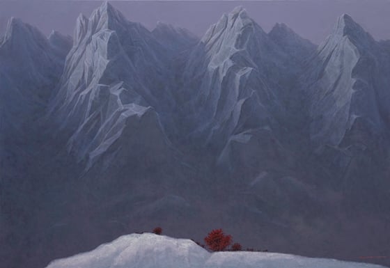 ‘인왕산’연작시리즈 중엔 어마어마한 위압감으로 화면 전면을 억누르는 산세 아래 나무를 키워낸 작은 언덕이 보이는 작품들이 있다. 처음에 나무 한 그루 풀 한포기 없는 삭막한 위압감만의 그 거센 산세를 보며 “인왕산 같지 않은데요?”하니 차 교수는 “인왕산은 그 아래 작은 언덕”이라 일러준다. “그 큰 산은 북한산이어도 좋고 히말라야여도 좋다”는 설명도 부연한다.