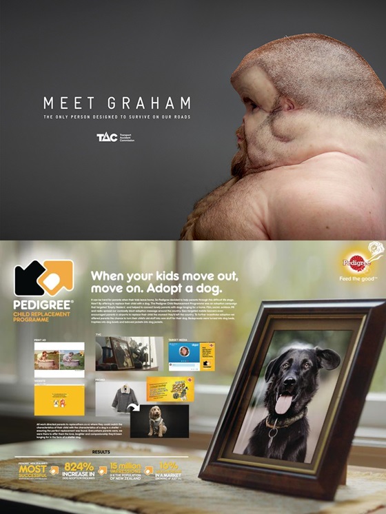 뉴질랜드의 콜렌소 BBDO(Colenso BBDO)가 제작한 페디그리사(社)의 '자식의 빈자리를 채워주는 유기견(Child Replacement Programme)'은 성인이 된 자식이 집을 떠나 ‘빈 둥지 증후군(Empty Nest Syndrome)’을 겪는 부모에게 자식의 성격을 닮은 유기견을 입양 해주는 내용을 담고 있다.