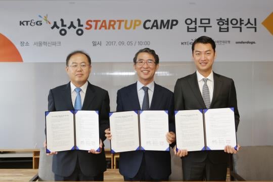 KT&G는 5일 이상학 KT&G 지속경영본부장, 김용덕 사회연대은행 대표상임이사, 김정헌 언더독스 대표 등이 참석한 가운데 서울혁신파크에서 ‘KT&G 상상 스타트업 캠프’ 업무협약(MOU)을 체결했다.