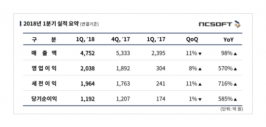 엔씨소프트(대표 김택진)가 2018년 1분기 실적 결산(연결기준) 결과 매출 4,752억 원, 영업이익 2,038억 원, 당기순이익 1,192억 원을 기록했다.