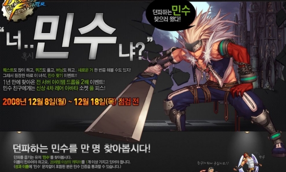 아직까지도 언급되고 있는 그 전설의 이벤트, 던전 앤 파이터 '민수 찾기' 이벤트다. 민수라는 이름을 가진 유저에게 가장 많은 추천을 받은 상위 20명에게 4차 레어 아바타를 지급하는 이벤트였다.