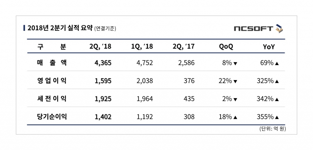 ㈜엔씨소프트(대표 김택진)가 2018년 2분기 실적 결산(연결기준) 결과 매출 4,365억 원, 영업이익 1,595억 원, 당기순이익 1,402억 원을 기록했다.