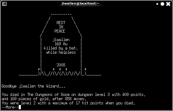 <로그>를 비롯한 많은 로그라이크 게임들은 플레이어 캐릭터가 한번 죽으면 그걸로 게임이 완전히 끝납니다. 그때까지 들인 시간이 얼마이든, 죽음이 찾아오면 그걸로 끝입니다. 저장도 되지 않으며, 종료되면서 저장된 파일도 완전히 삭제됩니다.
