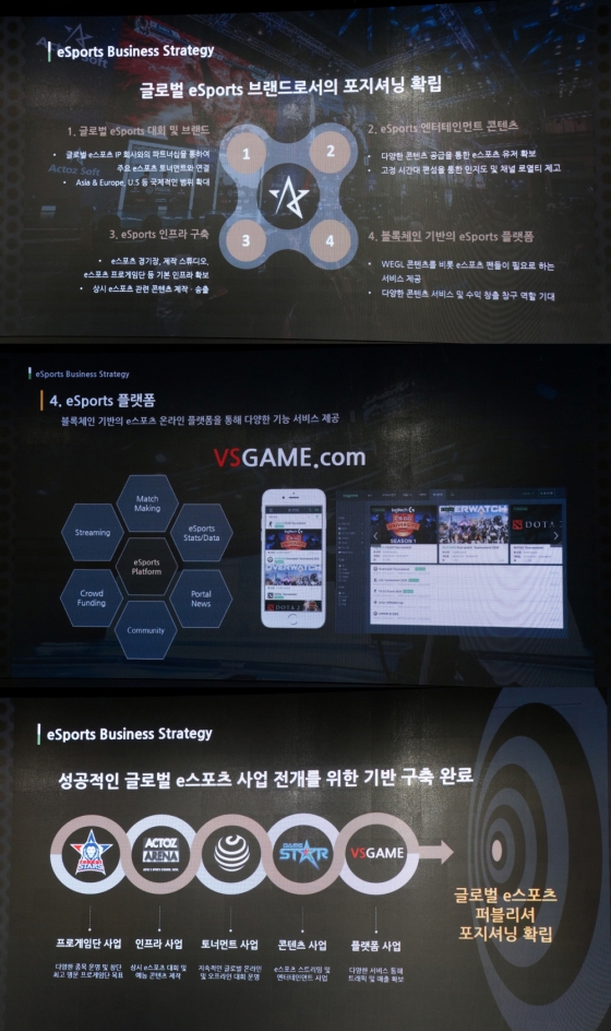 끝으로 블록체인 기반의 e스포츠 플랫폼 'VSGAME.com'을 통해 매치 메이킹, 스트리밍 서비스, e스포츠와 관련된 각종 데이터 제공, 선수와 구단의 사업을 위한 클라우드 펀딩, e스포츠 뉴스, 커뮤니티 등 다양한 기능을 제공할 예정이다. 조위 이사는 "한국은 물론 글로벌을 지향한 플랫폼 사업으로, 많은 돈을 들여 좋은 도메인을 확보했다"며 "블록체인 기술을 결합해 혁신적인 플랫폼을 만들 것이다"라고 강조했다. 'VSGAME.com'은 지난 5월부터 개발을 시작했으며, 2018년 말 1차 오픈을 예정하고 있다.