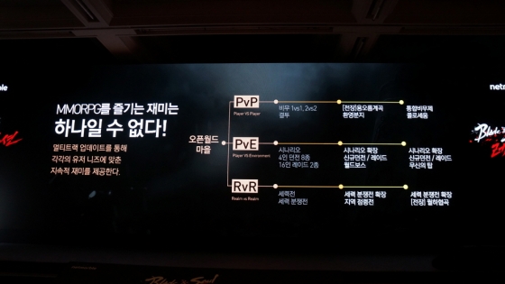 끝으로 블소 레볼루션은 다양한 유저의 니즈를 만족시키기 위해 매 업데이트마다 PvP, PvE, RvR 콘텐츠를 균등하게 추가한다는 계획이다. 장현진 개발총괄은 "원작의 감성을 모바일에 잘 담아내면서 모든 유저가 커뮤니티를 즐길 수 있는 진정한 모바일 MMORPG 블소 레볼루션에 많은 기대 바란다"며 발표를 마쳤다.
