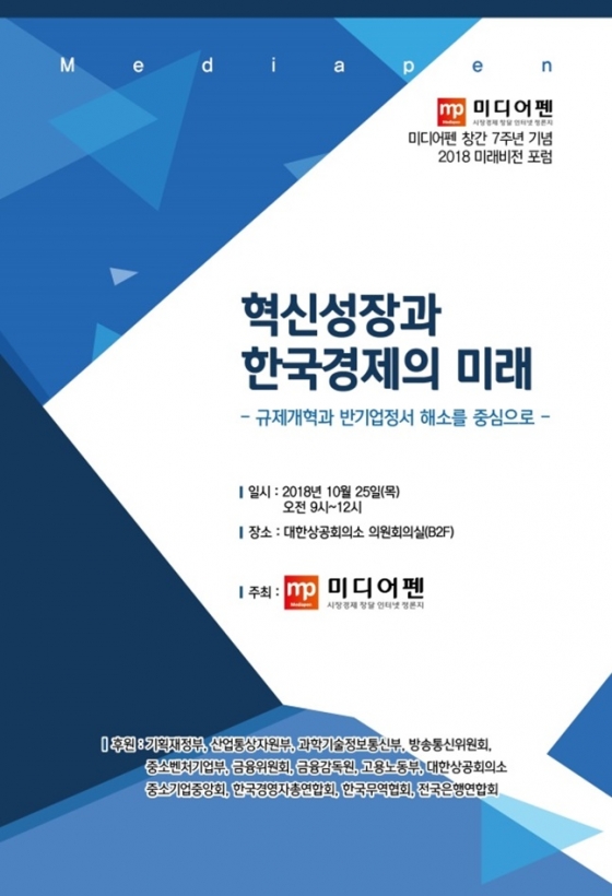 미디어펜이 창간 7주년을 맞아 <혁신성장과 한국경제의 미래:규제개혁과 반기업정서 해소를 중심으로>란 주제로 '2018 미래비전 포럼'을 오는 25일 오전 9시 서울 세종로 대한상공회의소 의원회의실(B2F)에서 개최한다.