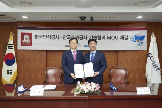 한국인삼공사 김재수 사장과 한국조폐공사 조용만 사장은 12일 한국인삼공사 서울 본사 사무실에서 만나 ‘짝퉁’ 방지를 위한 브랜드 보호기술 협력을 골자로 하는 양해각서(MOU)를 체결했다.
