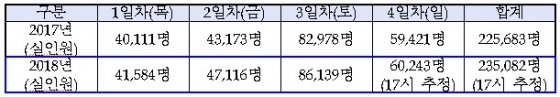 4일 간 ‘지스타 2018’을 찾은 일반인 방문객은 개막일인 11월 15일(목) 4 만1584명을 시작으로 16일(금) 4만7116명, 17일(토) 8만6139명, 마지막 날인 18일(일) 6만243명(17시 현재)까지 전체 23만5082명(추정치)으로 집계됐다. 전년(22만5683명) 대비 약 4.1% 증가한 수치다.