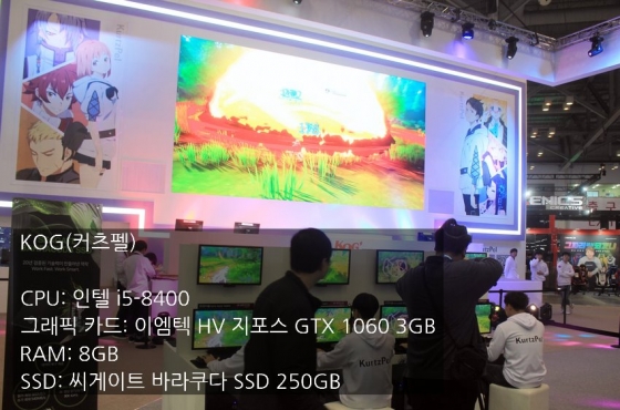 ‘커츠펠’ 시연 PC 사양을 살펴보면, CPU는 인텔 i5-8400, 그래픽 카드는 지포스 GTX 1060 3GB, 램은 8GB가 사용됐습니다. CPU는 8세대 제품 중 가장 저렴하지만 나름 안정적인 성능을 자랑하는 것으로, 55대 가량의 시연 PC 전체에 해당 부품을 적용해 게임에서 펼쳐지는 화려한 전투를 부드럽게 구동했죠. 또한, 그래픽 카드도 표준으로 꼽히는 지포스 GTX 1060 3GB라는 점에서 시연 PC를 게임 권장사양에 맞춘 느낌이 강한 편입니다.