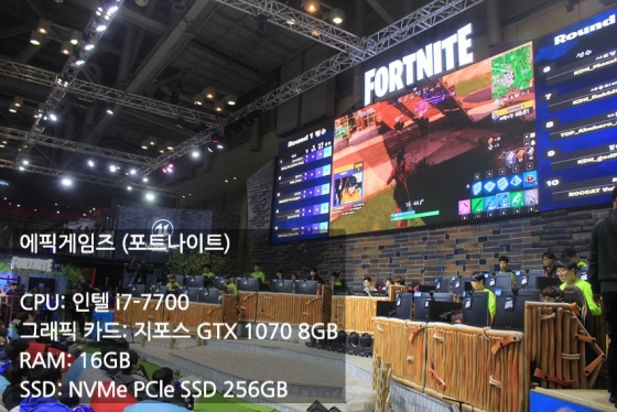 아시다시피 ‘포트나이트’ 자체는 그다지 높은 사양을 요구하는 편은 아닙니다. 하지만 이번 ‘지스타’ 현장 부스에서는 막힘 없는 플레이를 보여주기 위해 시연용 PC에 신경을 많이 쓴 티가 납니다. CPU는 인텔 i7-7700, 그래픽 카드는 GTX 1070 8GB, 램은 16GB를 사용하고 있죠. 지금은 8세대가 출시되어 다소 주목도가 죽었지만 월등한 성능을 가진 게이밍 CPU로 유명한 i7-7700, 성능과 가격 두 마리 다 잡은 GTX 1070 8GB가 탑재됐습니다. 100명이 한 전장에 모여 싸우는 ‘포트나이트’에게 최적의 선택이겠네요.