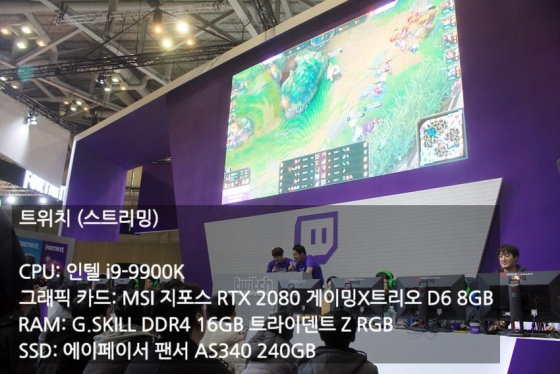 스트리머들이 한 자리에 모이는 트위치 부스. 본래 뛰어난 게이밍 PC를 보유한 스트리머들 입맛에 맞추려면 평범한 PC로는 어림도 없겠죠. 특히 다른 부스처럼 게임 하나를 메인으로 내세우지 않고, 다양한 게임을 한다는 점에서도 특히나 좋은 PC가 필요할 겁니다.