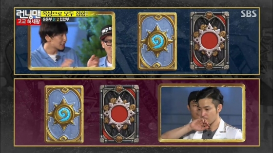런닝맨은 매회 독특한 미션을 부여하고 출연자들이 해결해 나가는 과정(이라고 부르고 배신의 연속이라 읽는다)을 담는 예능프로그램인데요, 미션카드의 뒷면이 '하스스톤' 카드의 이미지를 차용해 화제가 되었습니다.
