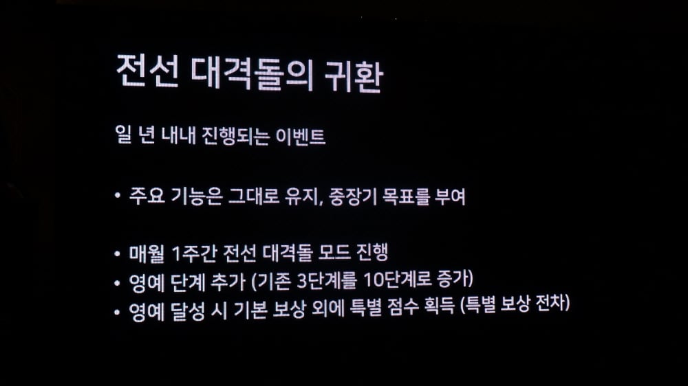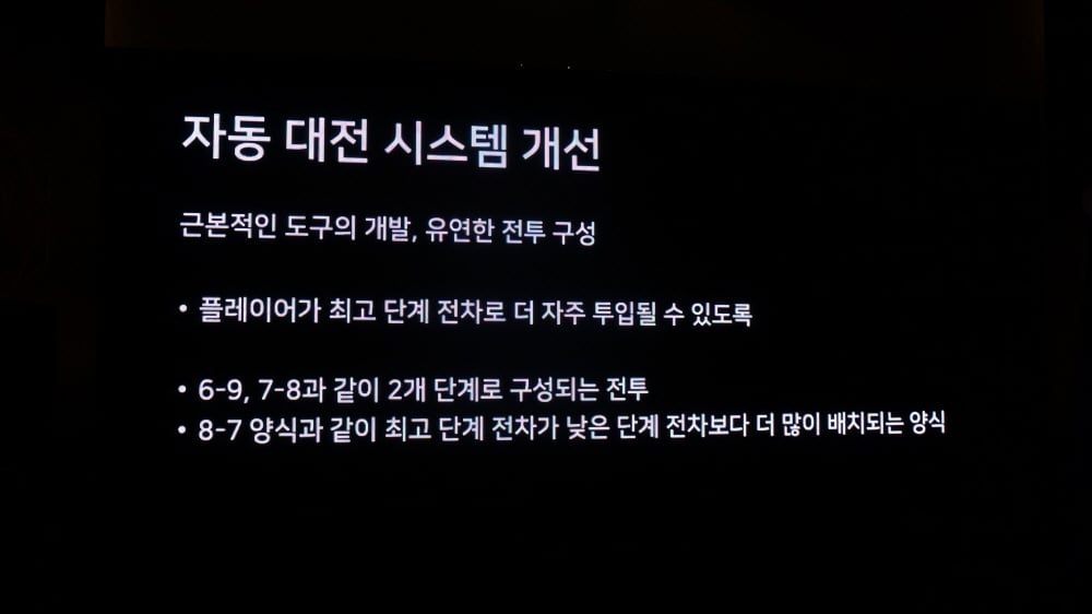두 가지를 주목해줬으면 한다. 하나는 자동 대전 시스템이다. 플레이어 관점에서는 자동 대전 시스템이 가장 중요하고 밀접한 관계를 갖고 있기 때문이다. 또 하나는 전선 대격돌이다. 수많은 요소가 새로 추가될 수 있지만, 가장 우선적으로 고려해야 하는 건 재미다. 자동 대전 시스템이야말로 플레이 경험에 직접적으로 영향을 주는 것이라 1등으로 꼽았다.