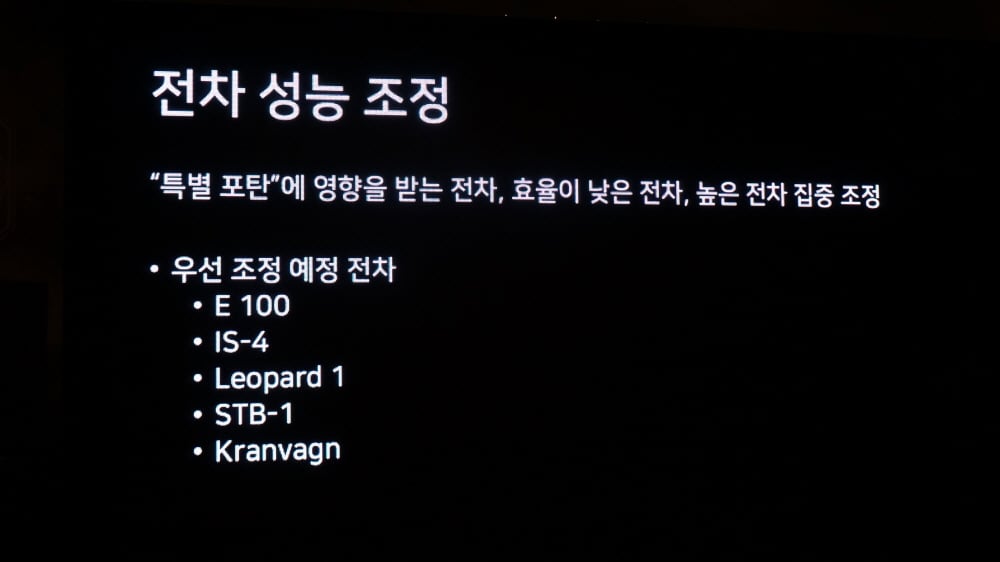 우선 순위는 두고 있지만, 순차적으로 진행하는 게 아니라 여러 전차에 동시다발적으로 약간씩 변화를 주며, 장기적으로 진행한다. 시간이 오래 걸리는 문제는 적을 것으로 본다. 일례로 중전차, 경전차는 특별 포탄 변경에 따라 파장이 있을 텐데, 여러 전차에 대해 동시에 변화를 적용해 나간다고 말씀드릴 수 있다.