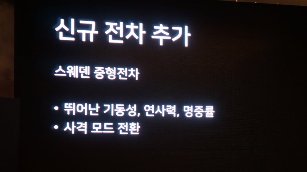 이어 "플레이어들은 기존 전차의 성능 조정 외에 새로 추가할 전차도 기대할 것"이라며 '사격 모드'라는 새로운 매커니즘을 도입한 '스웨덴 중형 전차'를 소개했다. '스웨덴 중형 전차'는 기본적으로 높은 기동성과 연사력, 명중률이 장점이며, '사격 모드'로 전환할 수 있는 게 특징이다.