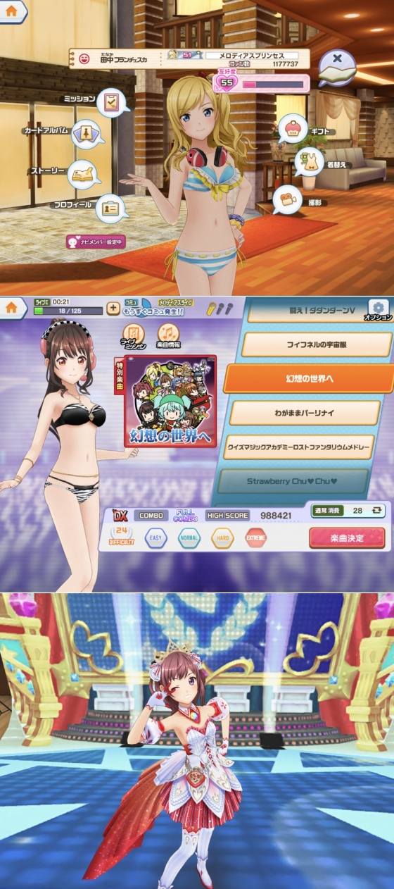게임 자체는 리듬게임에 아이돌, 그리고 연애 시뮬레이션 요소를 살짝 넣은 느낌입니다. 메인에 세워둔 아이돌과 대화할 수도 있고, 노래가 끝나면 커뮤니티 수치가 채워져 아이돌을 선택해 짤막한 대화를 나누기도 합니다. 애정도가 일정 치 채워지면 개인 대화가 열려 더 돈독한 사이가 되기도 하고, 프로듀서인 게이머를 부르는 호칭이나 아이돌을 부르는 호칭도 변경할 수 있습니다.