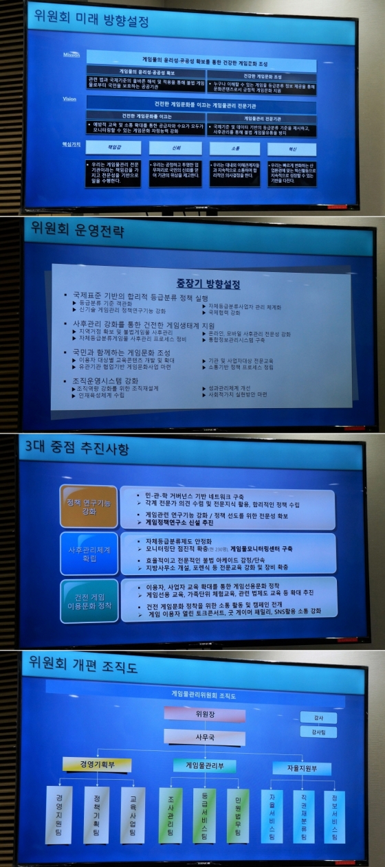 게임물관리위원회는 25일 게임물관리위원회가 위치한 골든브릿지빌딩 지하 1층 회의실에서 기자간담회를 열었다. 이날 간담회에서 게임물관리위원회는 새로운 비전 선포와 새로운 비전을 수행하기 위한 조직 개편 단행에 대해 발표하고 기자들의 질문에 답했다.