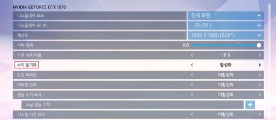 이를 방지하기 위한 ‘수직 동기화(V-Sync)’ 옵션도 나왔습니다…만, 이 방법 역시 완벽하지 않았습니다. 수직 동기화는 이런 테어링 현상을 막기 위해, 그래픽 카드가 출력하는 프레임을 모니터 주사율에 맞춰 제한하는 기능인데요. 가령, 60Hz 주사율 모니터를 쓰면, 그래픽 카드 성능이 60 프레임만 나오게 막는 것이죠.
